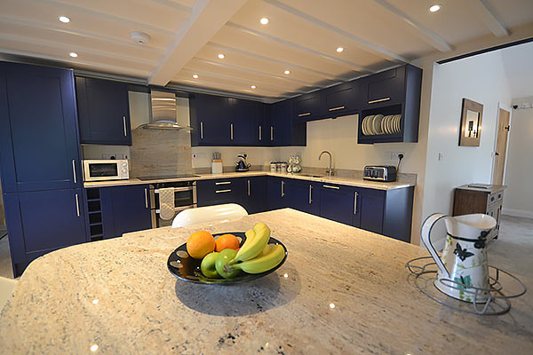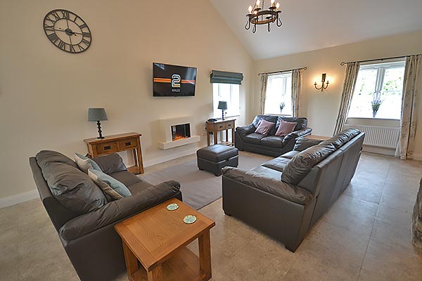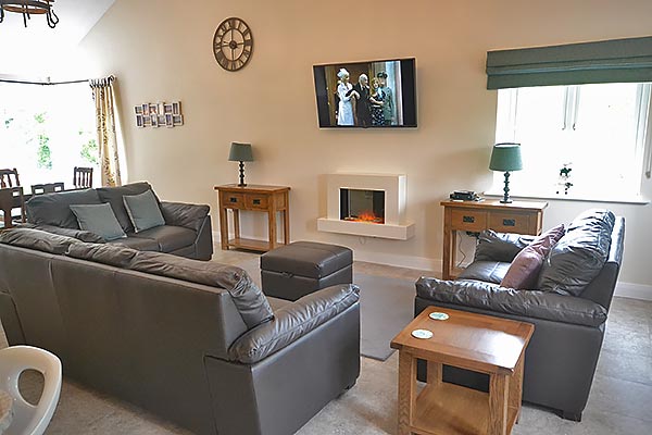 Downstairs there is also a large open plan kitchen/diner/lounge. The kitchen area features a beamed ceiling, whilst the comfortable lounge has an electric log effect fire and views of fields and surrounding countryside. Free WiFi is available for guests to use for internet access.