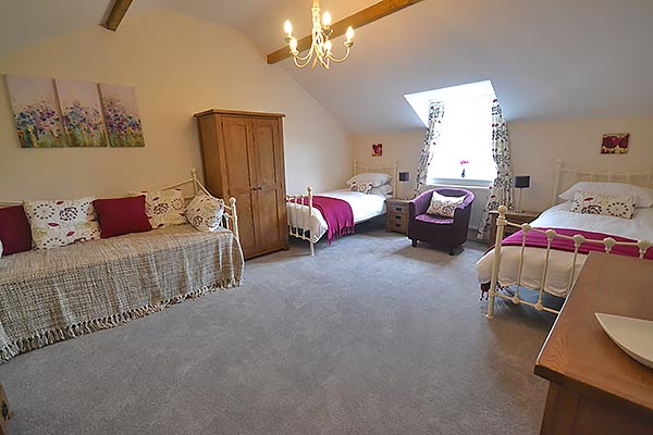 Upstairs there are 2 bedrooms (1 double and 1 twin), and a bathroom with jacuzzi bath and separate shower. The twin bedroom can have 2 extra single beds.